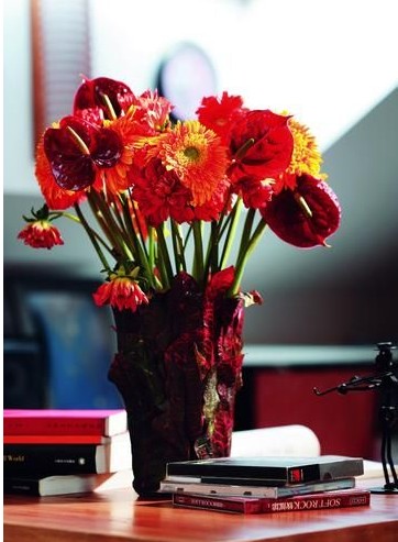 即使環(huán)境的溫度沒(méi)有發(fā)生變化,正確的顏色搭配也可使人心理“調(diào)溫”,花藝作品通過(guò)花卉自身濃重的深紅、橘紅、橘黃等暖色,將溫度提升。選用與花材同色系的花器,將變?nèi)~木的葉子貼在花瓶表面,形成“葉子做成的花器”,使整體的自然氣息更加濃厚。