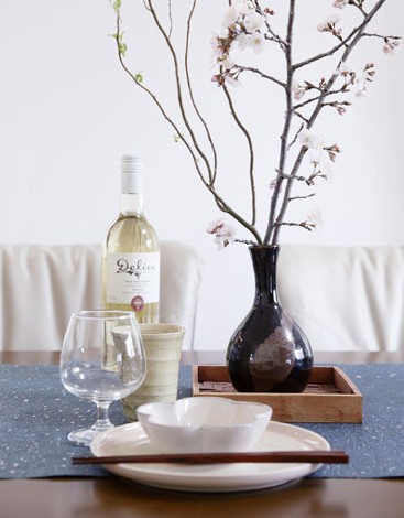 藍色桌布讓人覺得淳樸,木質(zhì)托盤與深棕色的花瓶營造出一絲舊時回憶的味道,也頗具民族特色。一株新采來的花枝帶給人希望,同時把餐廳變得典雅。一瓶洋酒,一只高腳杯,在雅致的頗帶民族味道的餐廳中,成功融入了現(xiàn)代的元素,更有一番別致的風(fēng)情。