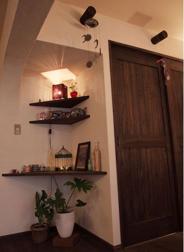 利用墻壁的凹凸度,用木板將墻角打造成多層的開始放儲物格。既與開放式的主題空間相符,又增加了空間的實用度。隔板的大小可以任意選擇,從下至上漸小的樣式,讓角落變得梯度感十足。高處掛上旅游時買來的民族特色風(fēng)鈴,空間的裝飾元素變得多元化。擺放些可愛的小玩意兒,瞬間裝扮出一個可愛有趣的小角落。最下方可以選擇一兩顆體積適合的綠植,裝扮空間又凈化空氣。