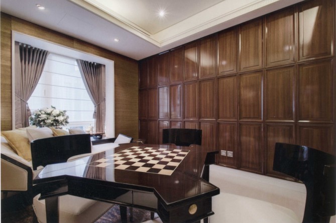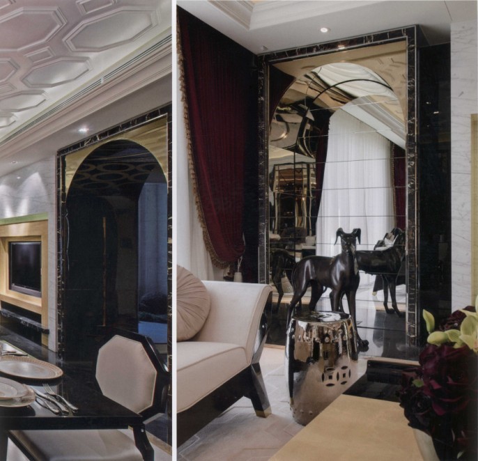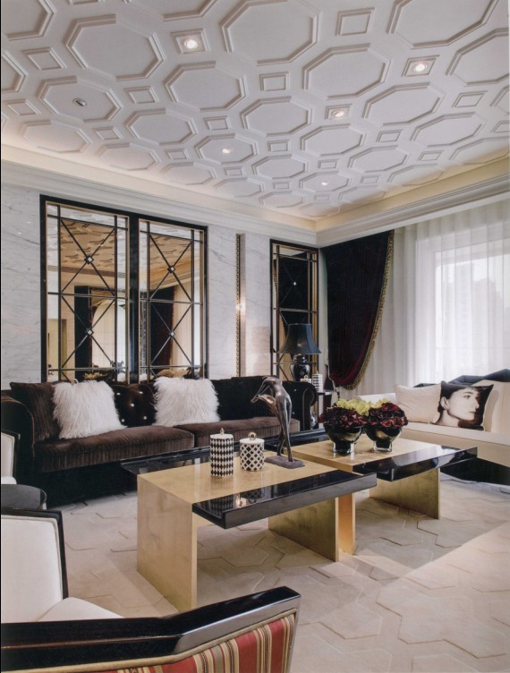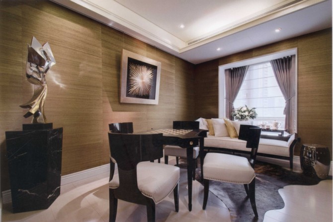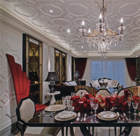 六角形的浮雕效果天花,繼續(xù)延伸到餐廳主墻,強(qiáng)調(diào)立體而別具個(gè)性的空間感。新古典優(yōu)雅而繁復(fù)的桌椅造型,強(qiáng)調(diào)質(zhì)感而非雕梁畫棟的裝飾家飾,反而更凸顯了整體空間的奢華感。