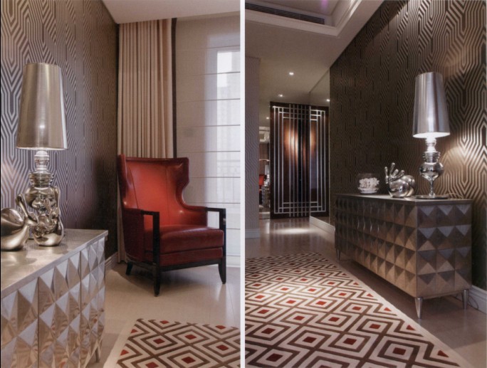 本戶型面積較大,為了打造富豪門第、都會(huì)城堡般的格調(diào),大量運(yùn)用對(duì)比強(qiáng)烈的色彩,耀眼夸飾的藝術(shù)造型突顯其不凡,以展現(xiàn)時(shí)尚莊園豪邸的大氣尺度。在空間裝修上,設(shè)計(jì)師運(yùn)用西方古典工藝的嚴(yán)謹(jǐn)精湛手法,同時(shí)將東方文藝復(fù)興的精神注入其中。整體空間氛圍傳遞著西方的浪漫,卻也輕訴著東方的曼妙----透過古典與現(xiàn)代裝飾藝術(shù)的交匯融合,顯示出復(fù)古、融匯、創(chuàng)新與再生的精神。老上海的清新魅力,為空間注入豐碩的生命力,也為居住者帶來全新的心靈悸動(dòng)。