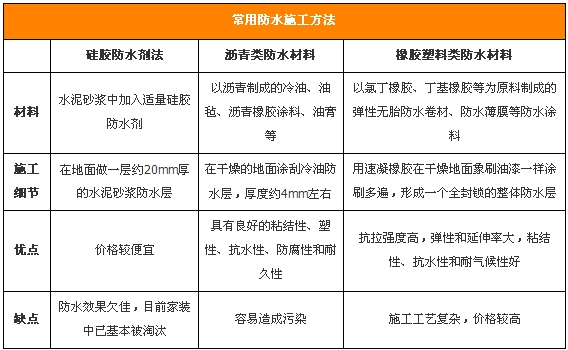 以前的防水方法有疏導(dǎo)、引導(dǎo)、堵塞以及灌撅,但是現(xiàn)在一般都使用防水材料,最實(shí)用的。用防水材料來(lái)說(shuō),家裝中防水項(xiàng)目主要針對(duì)廚房和衛(wèi)生間的地面,防水施工材料主要有三種,即水泥砂漿、冷油、新型材料等,相應(yīng)的也有三種防水施工方法: