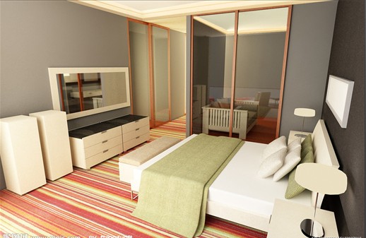 第二步:臥室中最主要的家具應(yīng)該是床,但衣柜的地位也很重要。選擇一組實櫸木的衣柜,有三個大抽屜,里面可以放衣服和其它日用品,抽屜上面的開放空間可以方便的放置許多物品,電視置于其中,充分地利用了空間。磨砂玻璃柜門,其質(zhì)感使室內(nèi)顯得明亮開闊。再有,用兩個相同顏色的櫸木床頭柜作為床的搭配。床頭柜有很深的抽屜,里面可以放一些必需品。柜子上面還可以放臺燈穿衣鏡、掛衣鉤雖然是小東西,但其在居室中往往有不凡的效果。用與床同質(zhì)感的穿衣鏡及掛衣鉤,在早上就能從容地穿上襯衣,忙而不亂地打理自己。