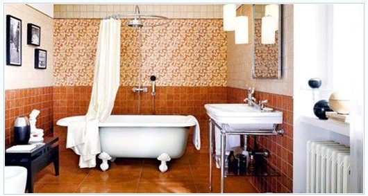 還有一種混搭方式是將墻面分為三個區(qū)域,采取漸變的方式鋪貼:上部可以選用小規(guī)格淺色系瓷磚;中部全部鋪貼同色系的花磚,組合花磚和獨立花磚皆可;下部鋪貼顏色較深的墻磚,和地面保持同一色系,地面使用相同或鄰近墻裙色彩的大規(guī)格瓷磚,過渡自然,空間整體統(tǒng)一?;ùu的使用可以只限于一面墻的中部,并且可以在兩側(cè)的墻面上部留白,釋放空間。
