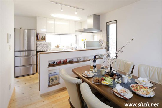 這里是開(kāi)放是的廚房及用餐區(qū)域,對(duì)于小戶(hù)型是節(jié)約空間的最好的方法,白色和淡褐色的顏色為主色調(diào),讓我們能夠放松心情。褐色木質(zhì)的長(zhǎng)桌,搭配白色皮質(zhì)的椅子,餐桌上的一株梅花,淡淡的粉色,更飄散出甜美之感,并且深藍(lán)色的桌簾,白色的小點(diǎn)點(diǎn)點(diǎn)綴,猶如一片星空,浪漫溫馨。將簡(jiǎn)約的田園氣息及歐式風(fēng)格浪漫風(fēng)情表現(xiàn)的淋淋盡致。