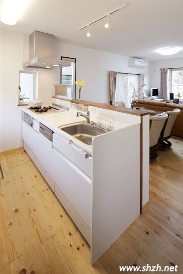 我們可以很清楚的看到櫥柜選擇的是白色加褐色的櫥邊,盡顯廚房的干凈整潔及與客廳的和諧。金屬的水池,易于打掃的同時(shí),也給白色的臺(tái)面增添了純自然的色彩。金屬材質(zhì)的支架靠近水池,將洗干凈的碗盤(pán)放在里面,不僅可以讓餐具的水再流回水池,而且可以避免手滑摔碎餐具,一舉兩得。
