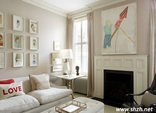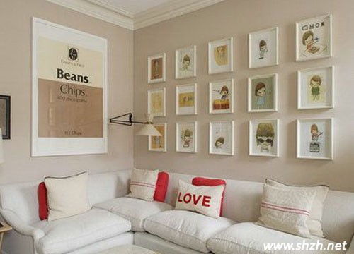 代替一整幅的壁畫,用多個小相架裝飾單調(diào)的墻壁,還能展示新婚夫婦的結(jié)婚照,讓客廳縈繞著甜蜜。紅白搭配的抱枕起到隔開大片白**塊的作用,讓房子達到冷暖平衡。