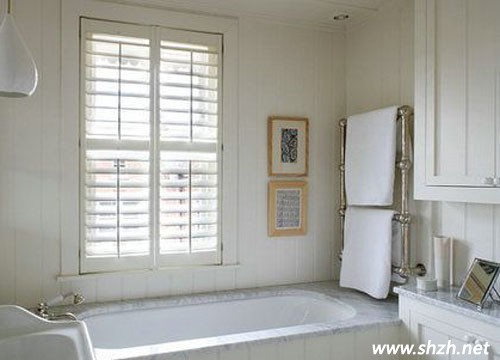 白色的木柵欄百葉窗,讓房子有多了一絲恬靜、一絲平和,搭配幾乎全白的設(shè)計,浴室更加舒適。一點淡黃色的點綴,顯得純潔的白色更加明亮。