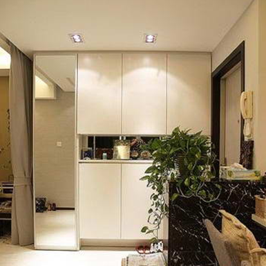 玄關(guān)儲(chǔ)物的設(shè)計(jì)、美觀又使用, 收納柜中間裸空了一橫,用來擺點(diǎn)小飾品和鑰匙。