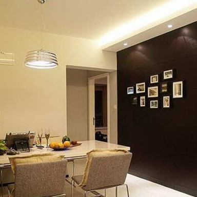 餐廳,有別于客廳的溫和顏色,選擇了比較深沉的黑色,再利用不同size的相框,堆砌成了一個(gè)相片的背景墻,整體看去,有點(diǎn)西餐廳的意味.