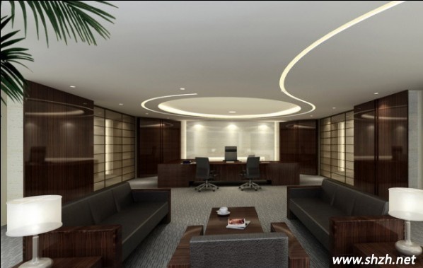如圖以上是采用現(xiàn)代中式風(fēng)格的空間,白色與黑胡桃飾面板的搭配也看起來十分惹眼,也能讓辦公室的裝修趨勢更加新潮,功能上選用了軟裝和辦公用家具。對于總經(jīng)理辦公室來說,沒有實用價值的特殊部件及任何裝飾都會增加造價,中式簡約的裝飾也會更加的環(huán)保,使辦公空間的空氣更好的流動,大大降低了對人體的傷害,舒適和健康的工作環(huán)境這也構(gòu)成了現(xiàn)代人的需求綠色辦公地點。