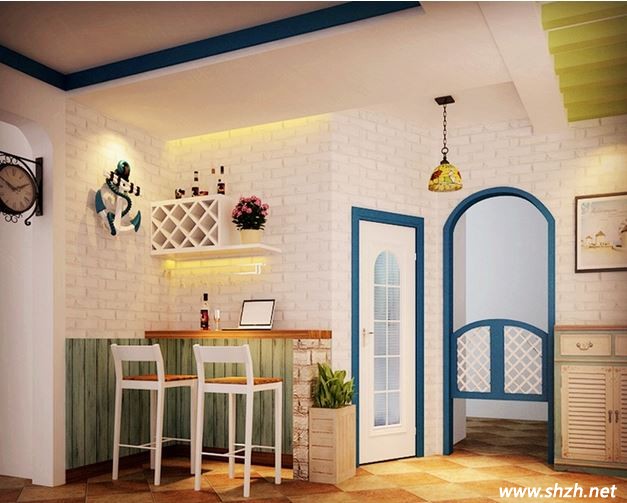 二:貼墻式吧臺(tái)。上海裝潢網(wǎng)小編認(rèn)為,如果你家是小戶型的房屋,除了餐桌式的多功能吧臺(tái),這種貼墻式的吧臺(tái)也是不錯(cuò)的選擇。設(shè)計(jì)要點(diǎn):把你喜歡的吧臺(tái)就緊貼著一段較小的墻面擺放,非常節(jié)省空間的設(shè)計(jì),另外要是想追求一下藝術(shù)效果的話,那么你可以在吧臺(tái)的上面就是頂棚嵌入漂亮的筒燈,不同顏色的光束打在你家精致的酒具上,整個(gè)效果會(huì)非常的時(shí)尚。