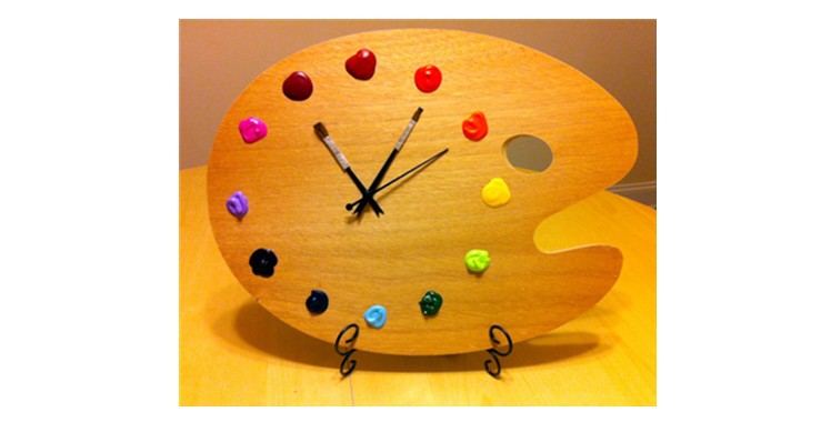 非常簡單的一款設(shè)計,采用實木打造的鐘盤,上面用彩色作為染料,筆刷為指針,很有創(chuàng)意且趣味十足??梢詫⑺鼟煸趦和块g里,給孩子生活的環(huán)境增添一份樂趣。