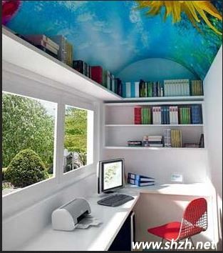 陽臺變書房:如果你家也是不足70平的一居室小戶型,那么肯定不會有多余的空間來設(shè)計出一個書房來享受靜靜閱讀的樂趣,這樣是不是就意味著你必須要放棄書房呢,那可不一定,因為你完全可以好好利用起你家的陽臺,只要改造的好一個小巧但是創(chuàng)意十足的書房便可輕松享有了。圖一中地中海風(fēng)格的小書房面積雖然很小,但是在功能上比起大書房毫不遜色,天藍(lán)色的吊頂與純白墻面、書架、書桌交相呼應(yīng),紅色的座椅成了這個小書房中的亮點,也是主人的別有用心。