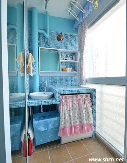 陽臺變洗衣房:陽臺的改造當(dāng)然遠(yuǎn)遠(yuǎn)不止改成書房,如果你家衛(wèi)生間的空間不大,或許只有一個馬桶與淋雨的地方,那么洗衣機(jī)放在那里比較好呢?小編給你建議:不要浪漫你家的陽臺,將陽臺改裝成洗衣房在現(xiàn)在小戶型裝修中很流行,而且把洗衣機(jī)放在陽臺中也非常的方便,衣服洗好了之后直接就可以晾曬了,看圖二中的小細(xì)節(jié),設(shè)計師連洗漱去也巧妙的安置在陽臺這個小空間里了。整體陽臺的改造都采用藍(lán)色的馬賽克,濃濃的地中海風(fēng)情撲面而來,非常清新的感覺。洗漱區(qū)要是不喜歡的話你也可以將這些地方改放成用來收納衣物或者是雜物的柜子,也是非常實用的設(shè)計,例圖三。