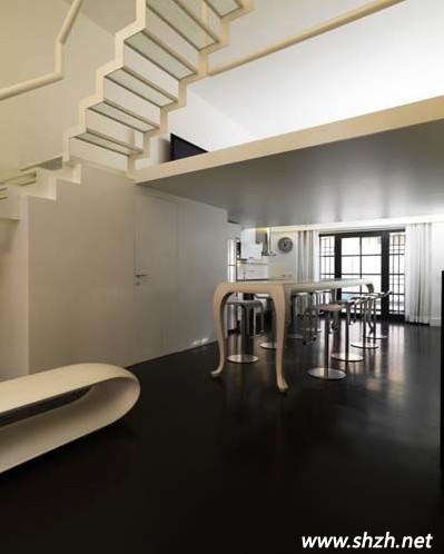 上海裝潢網(wǎng):圖一中的三幅是這個(gè)LOFT的第一樓,南北通透的房型最好布局了,設(shè)計(jì)師把廚房安放在進(jìn)門(mén)處,讓每一位來(lái)者第一時(shí)間感受到家的溫馨,轉(zhuǎn)身即到的餐廳中,餐桌采用吧臺(tái)的造型,時(shí)尚美觀,另外大家看見(jiàn)餐桌后的白色櫥柜了嗎?即使有很大的空間,設(shè)計(jì)師仍然沒(méi)有浪費(fèi)樓梯下的大好空間,在此打造了一個(gè)容量巨大的收納室。最后順著餐廳走過(guò),一樓的另一端墻壁也完全打開(kāi),門(mén)外的陽(yáng)臺(tái)也是一道風(fēng)景線(xiàn)。