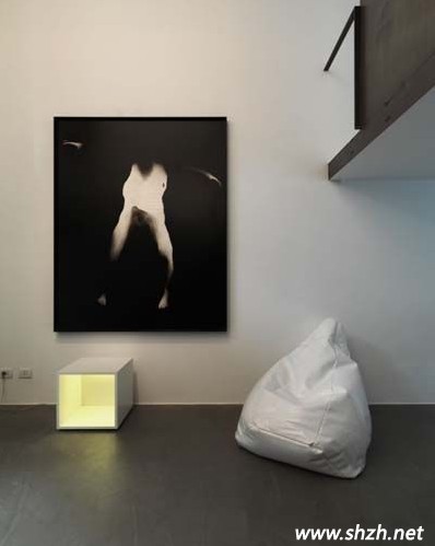 順著一樓的白色樓梯,簡(jiǎn)短的上行后,我們來(lái)帶了這個(gè)LOFT的二樓。二樓因?yàn)橐尦鰞蓚€(gè)樓梯的空間,所以剩下的空間被隔成一個(gè)“L”型,第一個(gè)樓梯的盡頭處就是這個(gè)小客廳了,沒(méi)有繁雜的裝修,簡(jiǎn)單的沙發(fā)、電視與榻榻米飄窗構(gòu)成了一個(gè)時(shí)尚個(gè)性的會(huì)客空間。走過(guò)客廳,轉(zhuǎn)身來(lái)到一個(gè)簡(jiǎn)易的工作區(qū)域,為了與一樓呼應(yīng),設(shè)計(jì)師干脆把工作臺(tái)也設(shè)計(jì)成吧臺(tái)的造型,讓你隨時(shí)享受吧臺(tái)樂(lè)趣。銜接客廳與工作區(qū)的過(guò)道處,一幅抽象畫(huà)點(diǎn)亮了單調(diào)的白色墻壁。