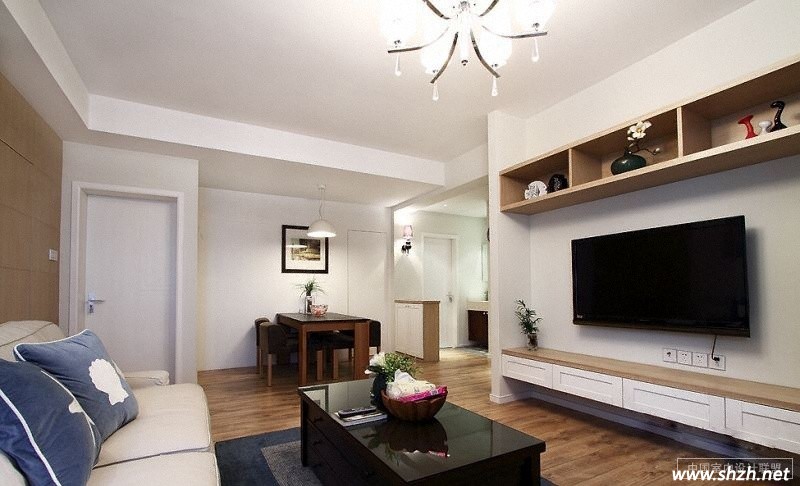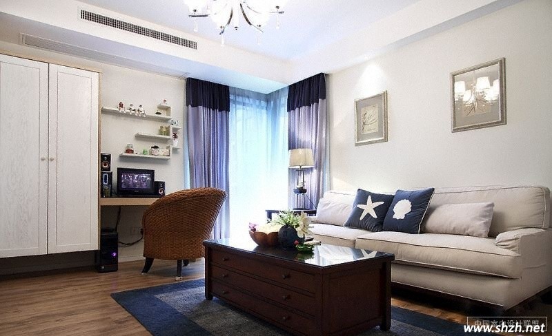 本套著重要說的就是地中海與日式混搭的客廳裝修,白色與木色的加入讓人們?nèi)缤蒙碓谏盍郑^對讓家變成“避暑山莊”。先來看看客廳的全貌,白色的沙發(fā)上藍色的布藝成了畫龍點睛的一筆,白色與木色結(jié)合的電視柜在此點明地中?;齑钊帐降闹黝},大家注意地面的原木色地板,這才是真正的精華。