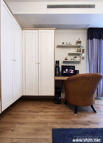 從這幅圖中我們發(fā)現(xiàn)了客廳中的另一個玄機,掩藏在衣柜盡頭的工作空間解決了小戶型中沒有書房的困擾,藤編的椅子清涼無限,白色的衣柜與白色的情面及沙發(fā)想照應(yīng),美妙的空間中,木色的茶幾也一個亮點,帶有三層抽屜的茶幾,典雅大氣。