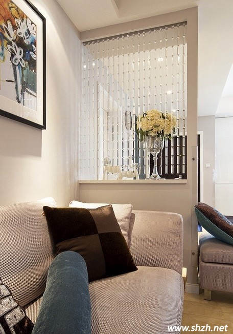 鏤空隔斷的設(shè)計(jì)出了上面的兩個(gè)創(chuàng)意,水晶幕簾也謂是一道搶眼的風(fēng)景線,透明的水晶簾與白色墻壁給人一種夢幻的感覺,加上玄關(guān)鞋柜上放置的透明玻璃花瓶與亮黃色的鮮花,室內(nèi)的一切都蒙上了童話般的色彩。