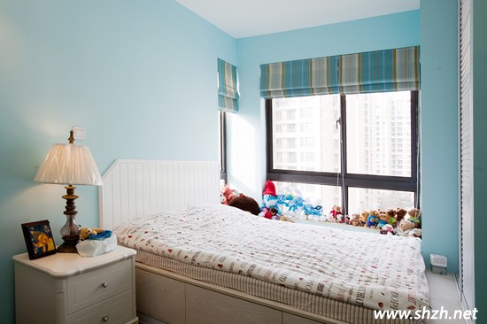 再來看下臥室的裝修,淡藍色的墻壁,使整個室內(nèi)溫度瞬間降低了幾度。而且藍色本身給人的感覺就比較清靜,它源于大海洋的顏色,非常的清涼舒適。