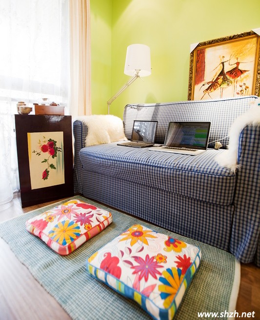 小格子的藍色布藝沙發(fā),布藝天然的感覺很好的襯托了美式風(fēng)格的裝飾。而兩個花朵圖案的坐墊,瞬間提亮了整個書房空間,為沉悶的書房增添了許多活躍的氛圍。