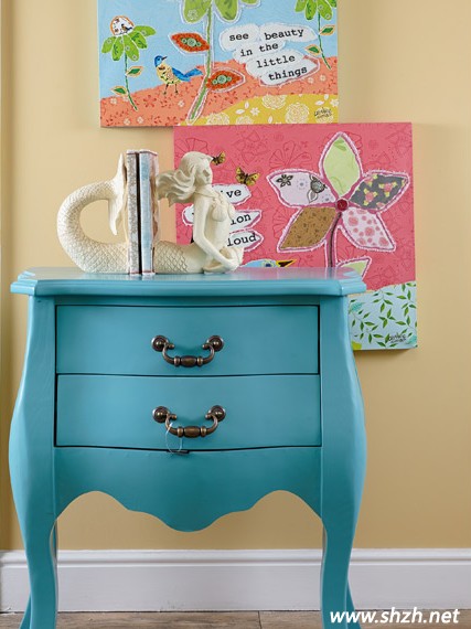 海藍(lán)色的家居柜子,清新而淡雅。美人魚裝飾藝術(shù)品,仿佛就像飄在海洋上一樣,等待著王子的出現(xiàn)。而墻壁上多彩的掛畫,非常清涼舒適。小小的角落里,顯現(xiàn)著童話世界里的美妙。
