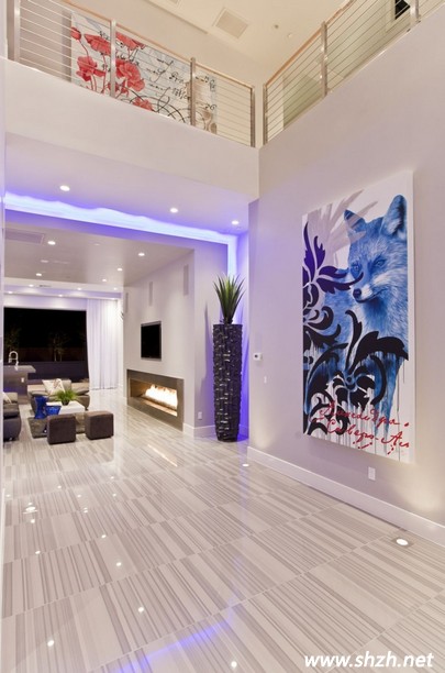 好一派奢華景象,白色的居室空間,寬敞明亮,沒有過多的線條,很簡約的設(shè)計,在這里,找不到繁瑣雜亂的空間,有的只是簡約帶來的舒適感。雖說簡約,卻一點也不簡單。紫色的吊頂,是那樣的迷人,那樣的夢幻,紫色給我們的感覺就是浪漫的代表,戀人之間,共進(jìn)燭光晚餐的時候,適當(dāng)?shù)淖⑷胱仙臒艄?,肯定會收貨滿滿的愛情。地板的鋪設(shè),非常有層次的感覺;而白色墻壁上的狐貍掛畫,給單調(diào)的墻面增添了樂趣,狐貍本身很邪惡,但是在這里,卻盡顯它幽默的風(fēng)采。