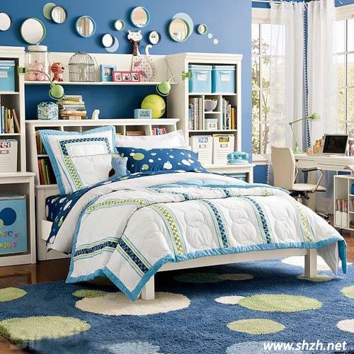 一樣子的原理,只不過這間房間的主人好像更熱愛學(xué)習(xí),床頭書柜上放滿了書籍,旁邊的書桌也看出主人所有的設(shè)計(jì)都是為了方便學(xué)習(xí),看來這個(gè)小主人還真是個(gè)不折不扣的讀書狂呢!藍(lán)白的主色調(diào)看上去清爽極了,正值炎炎夏日,喜歡的還在等什么呢?