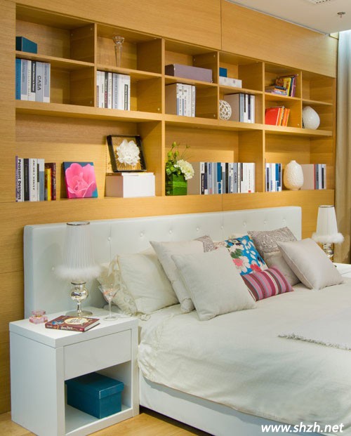 還想沒大家稱之為亂家女王嗎?或許這并不是你的本意,可大大小小的小飾品、各式各樣的裝飾擺件以及經(jīng)常要翻越的書籍在不知不覺間都讓你的臥室變得慘不忍睹了,那么為何不干脆利用床頭空間來做一個(gè)收納型的書柜,讓你的這些小物品都乖乖的呆在里面,這樣臥室想不干凈都難啦!