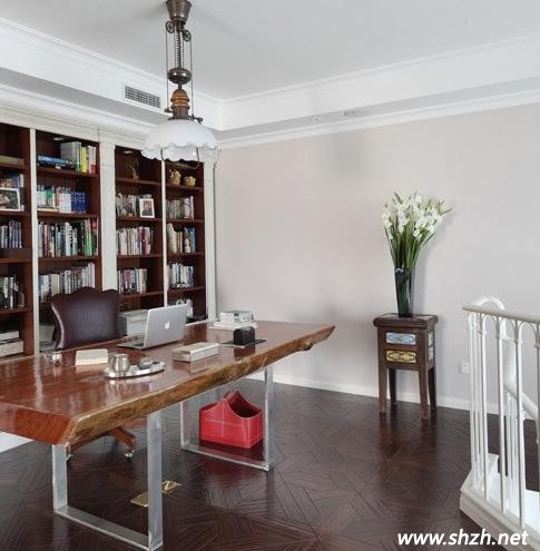 沿著階梯網(wǎng)上走,我們來到了主人的書房,非常典雅與別致,每一處都體現(xiàn)出主人熱愛學(xué)習(xí),熱愛生活的品質(zhì)。書房的空間是非常通透的,對面就是一個(gè)大的落地窗戶,除了自然采光好之外,還可以吸納室外的美景,讀書再累再疲倦只要一抬頭,美景就會(huì)將疲倦吹得煙消云散。我們還可以看到,吊燈的設(shè)計(jì)非常的具有特色,我想應(yīng)該是主人從海外購置回來的,因此能感覺得到主人對它的愛護(hù)。