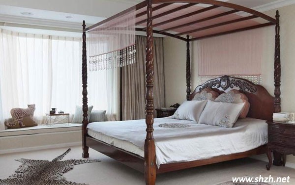 主人的臥室也設(shè)計(jì)的十分高貴,法式四柱大床,古典而雅致,不過,最大的亮點(diǎn)莫過于地上的豹皮地毯了,這是一種非洲的裝飾,遠(yuǎn)處的飄窗再一次成為家人的私享茶座。