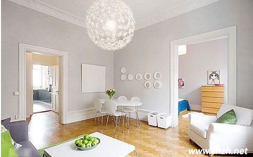 小戶型里,設(shè)計師一般都不會用很多色彩,一色的裝修會讓空間看起來更大。如果全是白色的屋子,會讓人不舒適,我們需要用一些小裝飾來改變??催^這么具有獨(dú)特的吊燈嗎? 獨(dú)特設(shè)計的綠色吊燈,再配上一小捆樹枝,體現(xiàn)出了“環(huán)保綠色”的生活理念。粉色的椅子又有一些活躍感。