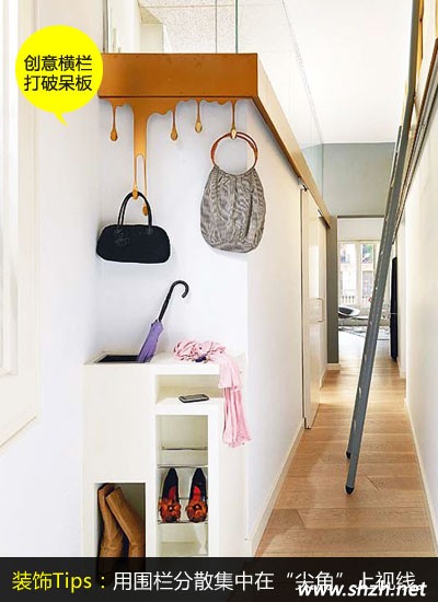 用木板做成的圍欄,向兩個(gè)方向延伸,從而避免了視線只停留在死角的局面,打破常規(guī),生硬感就從而得到了很好的改善,而圍欄下墜的水滴形狀掛鉤,創(chuàng)意無(wú)限,起到了很好的裝飾作用,同時(shí)也避免了呆板的直線效果,非常優(yōu)美。