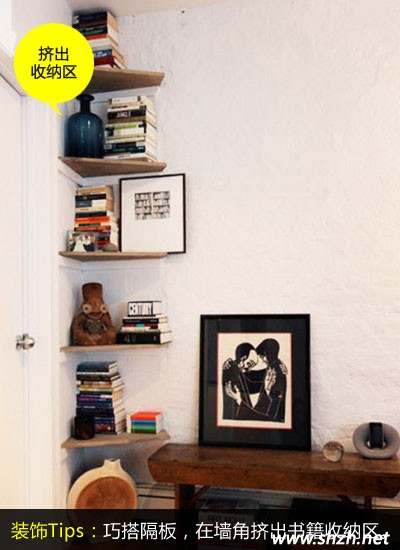 這款設(shè)計(jì)的亮點(diǎn)在于——再小的空間,也會(huì)有驚喜。采用三角形隔板搭配出來(lái)一塊書(shū)籍收納區(qū),讓每個(gè)空間都有利用的價(jià)值,并且還能憑空增添出一塊書(shū)房,這便是家居搭配的魅力和價(jià)值。