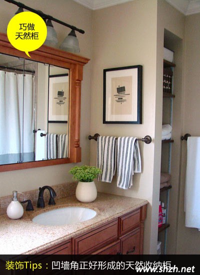 凹?jí)瞧鋵?shí)就是常見(jiàn)的格局硬傷,在空間的銜接處空余出來(lái)小空間,也許很多人并不在意,其實(shí),這樣的凹陷空間可以制作成一個(gè)收納區(qū)域,比如洗手臺(tái)墻體和承重墻體之間的凹?jí)潜恢魅饲擅畹淖龀闪祟孪词占{柜,不僅實(shí)用,還使得空間看起來(lái)更加的整齊美觀,優(yōu)雅大方。