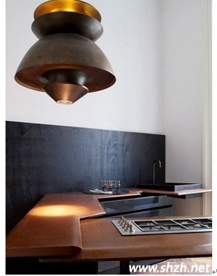 其實(shí)廚房空間還是比較規(guī)整的,但是主人卻將整個櫥柜和操作臺面進(jìn)行了不規(guī)則處理,層層疊疊的柜面增加了整個空間的層次感,打破了普通空間的中規(guī)中矩感。半墻黑色半墻白色的搭配也讓整個廚房空間變的很經(jīng)典,棕色的櫥柜店主其間,也讓整個廚房變的很典雅有氣質(zhì)。