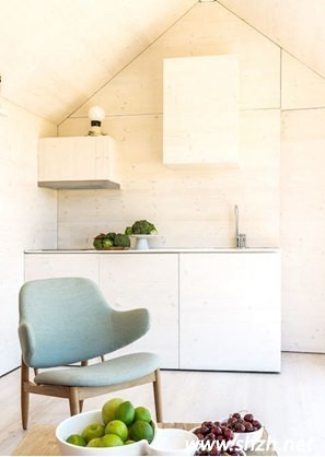 簡單的空間中,廚房空間采用了和整個墻面同樣的材質(zhì)來進(jìn)行設(shè)計(jì)。吊柜和操作面都和墻面融為一體,量身定制的櫥柜很好的節(jié)省了空間。簡單的廚房用具也是保證整個空間簡約風(fēng)格的重要因素。其上的吊柜可以放上裝飾物,點(diǎn)綴有點(diǎn)單調(diào)的墻面色彩。