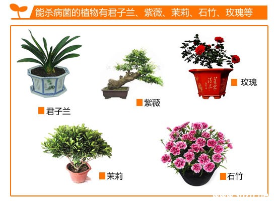 君子蘭、紫薇、茉莉、檸檬等植物,5分鐘內(nèi)就可以殺死白喉菌和痢疾菌等原生菌。薔薇、石竹、鈴蘭、紫羅蘭、玫瑰、桂花等植物散發(fā)的香味對(duì)結(jié)核桿菌、肺炎球菌、葡萄球菌的生長(zhǎng)繁殖具有明顯的抑制作用。玫瑰、桂花、紫羅蘭、茉莉、檸檬、薔薇、石竹、鈴蘭、紫薇等芳香花卉產(chǎn)生的揮發(fā)性油類具有顯著的殺菌作用。