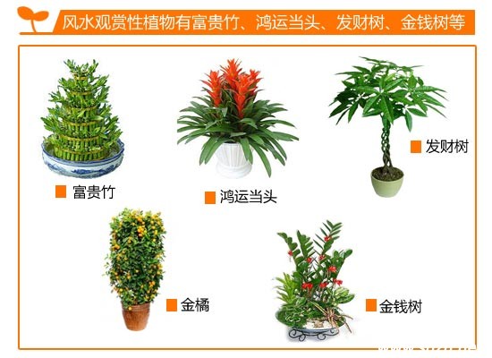 富貴竹、鴻運(yùn)當(dāng)頭、蓬萊松、七葉蓮、發(fā)財(cái)樹、金錢樹、招財(cái)樹、君子蘭、蘭花、仙客來(lái)、桔等植物因?yàn)槠涿Q蘊(yùn)含吉祥如意、恭喜發(fā)財(cái)?shù)脑⒁猓H受人們歡迎,被當(dāng)做家居風(fēng)水的裝飾???。