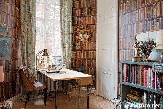 如果說前面兩者的熱鬧已經(jīng)叫你承受不住的話,那么這間書房絕對(duì)可以用驚人來形容了,四面的墻壁都被改成了頂天立地的書架,將小小的空間圍繞在書的海洋中,一張實(shí)木的書桌椅加上湖藍(lán)色的碎花窗簾,一切都美得有些夢(mèng)幻與迷離。
