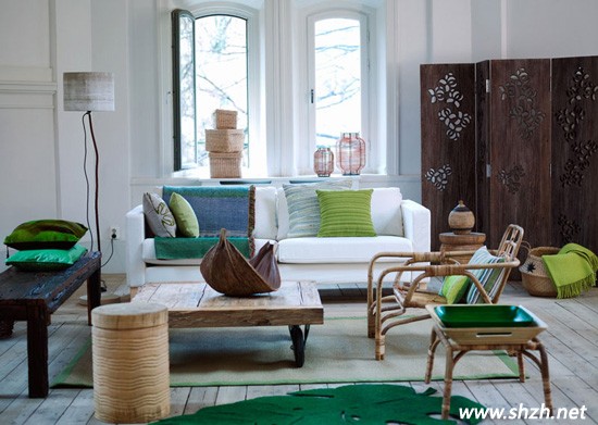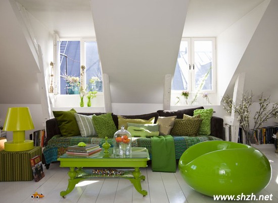 這款客廳設計,首先映入眼簾的其實是軟裝的色彩搭配上,非常清新自然,仿佛被大自然包圍的感覺一樣。不過,要重點說的是傾斜吊頂?shù)脑O計上,狹長空間采用傾斜的吊頂,從而使得空間更具立體感,在配上家居色彩,則緩和這壓迫的感覺。