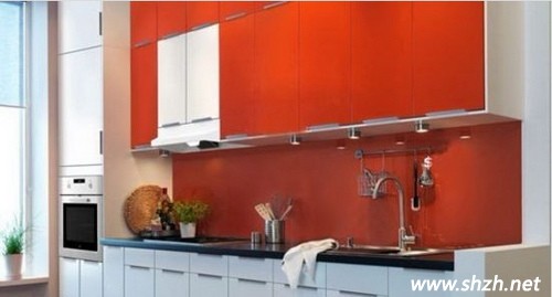 桔色,是時尚年輕的色彩,適合現(xiàn)代的青年夫妻使用。白色的櫥柜,黑色的臺面,使得空間變得生動靈活。櫥柜的收納功能非常強大,各種烹飪道具及廚房用具都能分隔開來擺放,關(guān)上柜門,整個區(qū)域顯得十分干凈簡潔。視覺上也能擴大空間的效果。直線型的櫥柜設(shè)計,可以將空間面積充分利用,這也是非常適合小戶型的廚房設(shè)計。