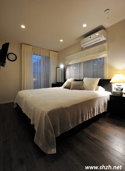 臥室并沒(méi)有做過(guò)多的裝飾,原木地板,簡(jiǎn)樸大方。床品也很簡(jiǎn)單卻非常溫馨舒適。同樣乳白色的窗簾,沒(méi)有過(guò)多的色彩裝飾,卻盡顯浪漫與恬淡。
