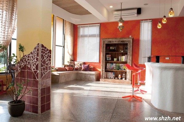 進入民宿的第一眼便會看到這間橙橘色的大廳,瑰麗的色彩引爆心中的熱情,且讓暖陽的氛圍醞釀休憩的心情,搭配上深藍色的吧臺避免,令人直呼設(shè)計師對于空間用色的大膽。小巧的馬賽克吧臺是民宿主人吳大哥夜間最佳表演場所。
