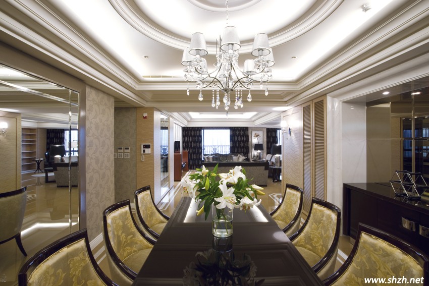 同樣與客廳相鄰的餐廚區(qū),沿著走出玄關(guān)左轉(zhuǎn)的主要動線,隨即進入客、餐廳間的緩沖地帶。餐廳上方多層次的天花造型,融合圓、方以及復(fù)式線條間的幾何變化,輝映水晶燈飾,與氣質(zhì)優(yōu)雅的古典餐桌椅組合形成親昵的對話,兩端還有典雅的百頁餐柜設(shè)計提升生活便利性,特別是墻體中央導(dǎo)角拼接的茶鏡背景,為視覺帶來低調(diào)的鏡面開窗效果,空間感更為開闊。