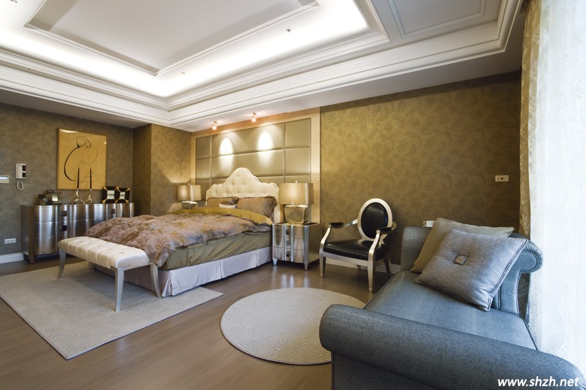 極度優(yōu)雅的主臥空間內(nèi)部機能動線的分配十分從容,既富有風情萬種的新古典魅力,也能嗅到現(xiàn)代風格的人文內(nèi)涵。整體布局上總計劃分為沉穩(wěn)、奢華的睡眠區(qū)、床尾兩側(cè)分別為專屬衛(wèi)浴與精美更衣間,低調(diào)優(yōu)雅的壁紙圖騰與沉穩(wěn)的木色相互輝映,床頭造型則以柔軟的方格絲質(zhì)繃布工法烘托私密的浪漫情懷,床尾的視聽墻擁有多元的復(fù)合機能設(shè)計,除了局部石材臺面擺放電視,上柜底部加裝嵌入式照明,細節(jié)處的經(jīng)營相對用心,表材木料與生俱來的細膩紋理,順著轉(zhuǎn)角弧形高柜一路延伸進入更衣間,為空間注入更多自然氣息。