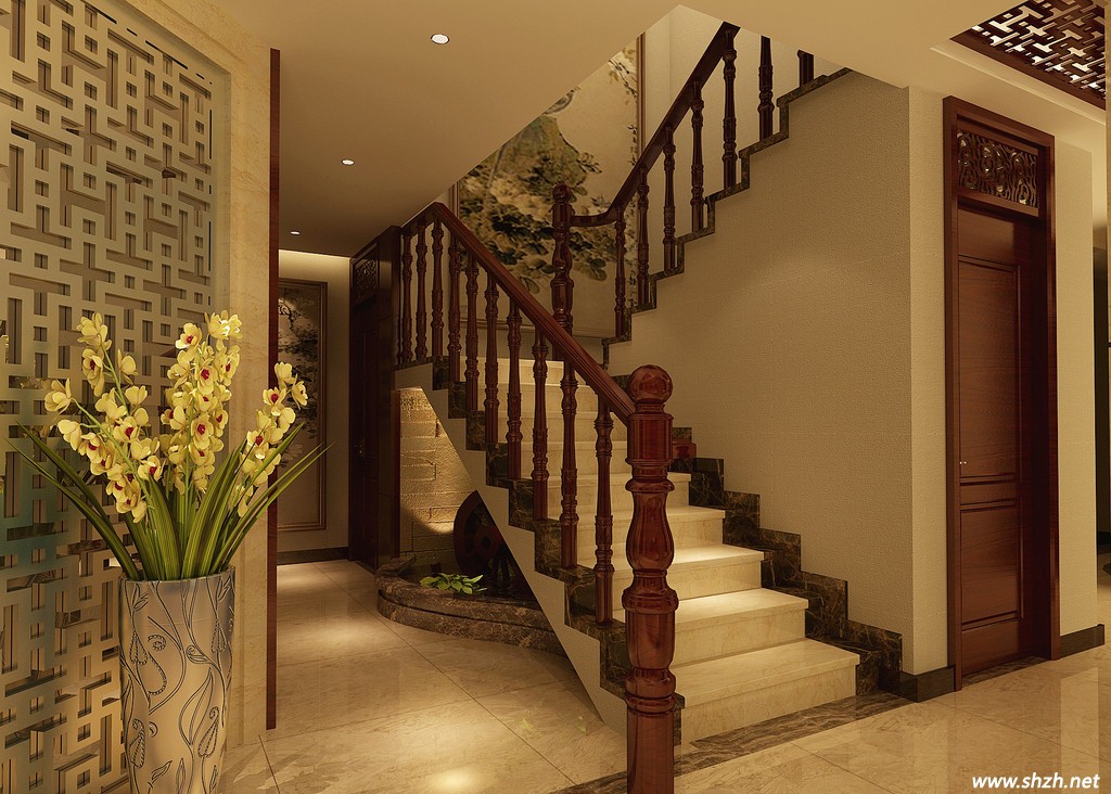 中式風格裝修風格能后贏得裝修市場的一塊蛋糕,中式風格的樓梯設計功不可沒。當下大多數(shù)的中式風格樓梯均采用實木欄桿和實木踏板的搭配,再通過含有中國多特的元素如木雕藝術、鏤空圍欄。打造中式儒雅的浪漫。