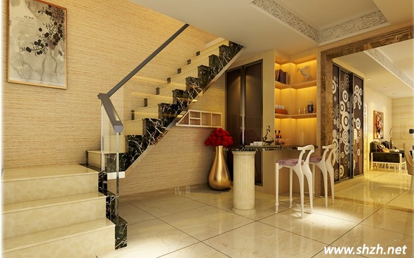 歐式風格樓梯設計以其華麗外表以及和裝飾風格而受歡迎,一般歐式風格的樓梯都是用大理石搭配實木欄桿,加上樓梯的護欄都是手工雕刻的,踏步漆面的濃烈色彩造就精美的歐式樓梯造型。