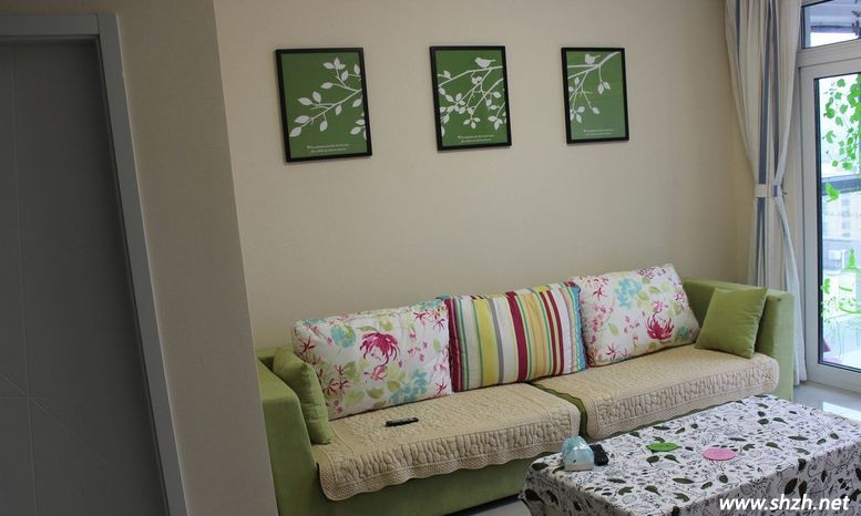 從陽臺開始來一一欣賞下主人的設(shè)計吧,玻璃玄關(guān)隔開的陽臺,讓客廳顯得更亮,玻璃上的綠葉透著夏日的清晰。陽臺上鐵制的桌椅又帶點小資情調(diào)。再到客廳沙發(fā)選擇的是綠色的,連沙發(fā)墻上掛飾物也是綠色。主人大面積采用綠色才裝飾就是突然主題小清新。但是怕過于單一乏味,就在抱枕上采用顏色的搭配。
